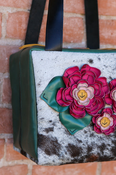 Cowhide Travel Case with Leather Sides and Leather Flowers and Leaves.