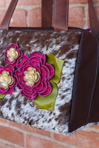 Cowhide Travel Case with Leather Sides and Leather Flowers and Leaves.